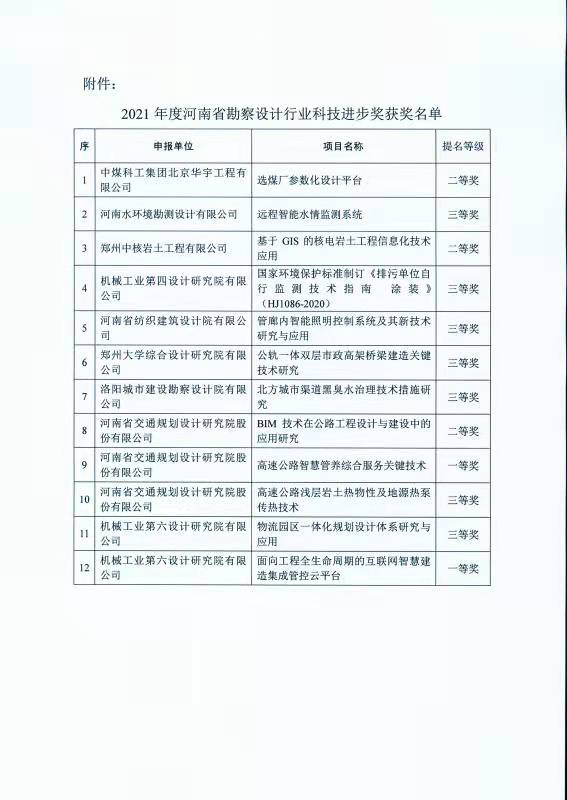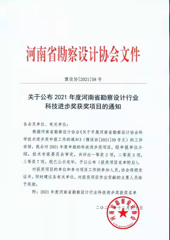 河南省勘察設計協會近日組織召開了“2021年度河南省勘察設計行業科技進步獎評會”經技術專家委員會審定,我公司科研項目《遠程智能水情監測系統》獲三等獎。