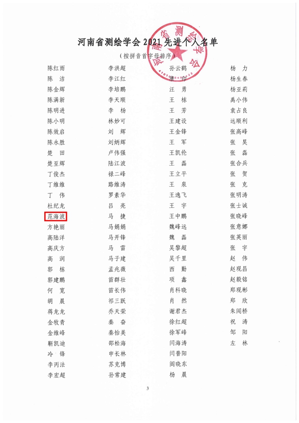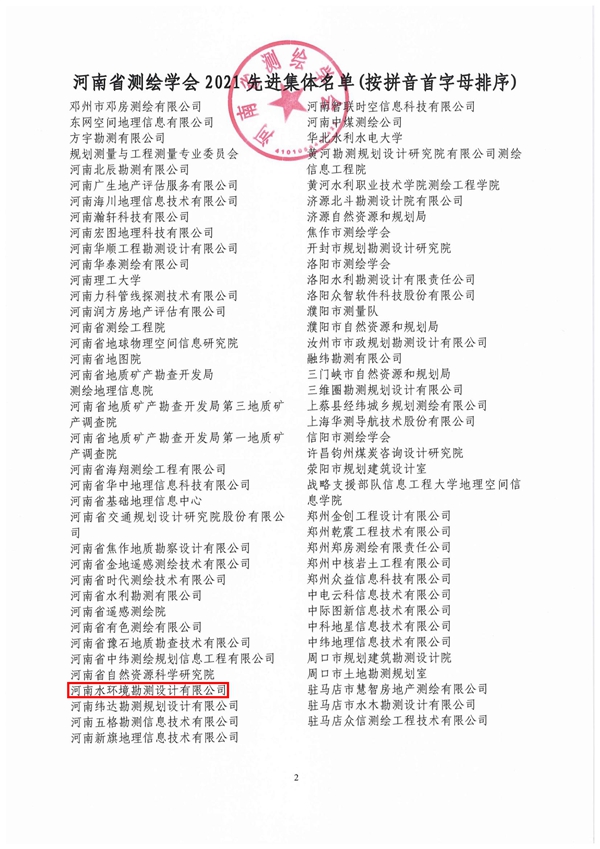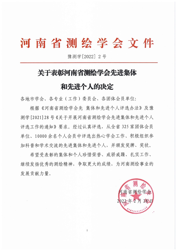 2月28日,我公司被河南省測繪學會評為河南省測繪學會先進集體榮譽稱號,公司范海波被評為先進個人,這充分說明了省測繪學會對我公司測繪工作的肯定,在今后的工作中,我們將繼續發揮測繪科技優勢,積極開拓市場,為開創新時期測繪工作新局面不懈努力!