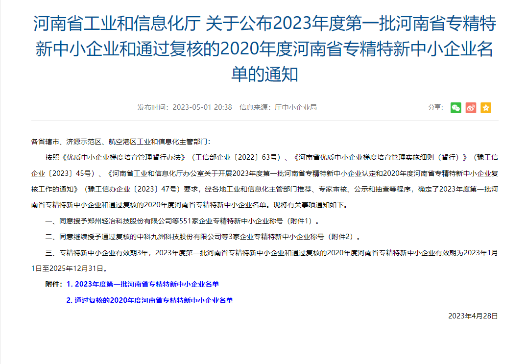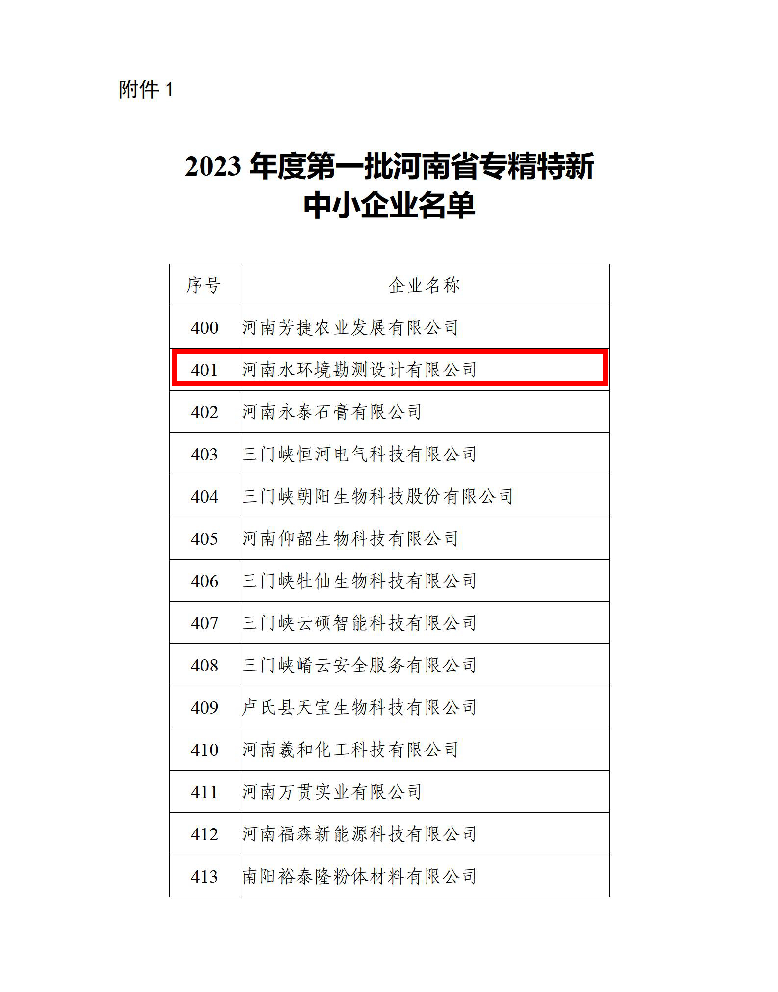 5月1日,河南省工業和信息化廳下發《關于公布2023年度第一批河南省專精特新中小企業和通過復核的2020年度河南省專精特新中小企業名單的通知》,河南水環境勘測設計有限公司成功獲批2023年度第一批河南省專精特新中小企業。