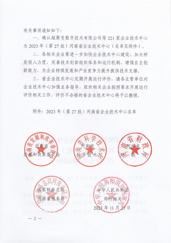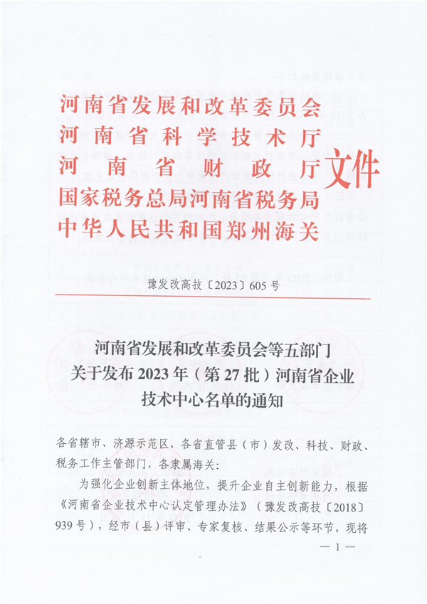 11月27日,河南省發展和改革委員會發布了《關于第27批擬新建省企業技術中心名單的公示》文件,我公司憑借自身的研發實力成功入選名單。
