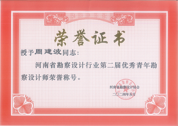 近日,在河南省勘察設計協會第二屆優秀青年勘察設計師認定中我公司周建波同志被評為“河南省勘察設計行業優秀青年勘察設計師”。